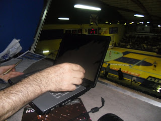 Numa das jogadas um jogador do Belenenses aliviou a bola esta foi bater numa viga superior do Pavilhão cair em cima do Computador de José Batista... partindo-o!