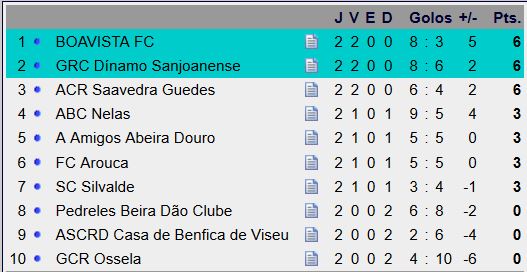 O Boavista lidera a classificação após a realização da segunda jornada do campeonato nacional de segunda divisão de futsal, somando por vitórias os jogos realizados